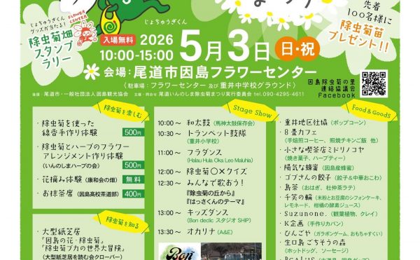 2026年4月10日イベント因島観光協会 馬神除虫菊畑 撮影プレゼント企画!馬神除虫菊畑に撮影用にアイテムを下記期間中設置します! ハッシュタグ(#2026馬神除虫菊畑)を付けてInstagram or X に投稿して下さった方の中から抽選で5名様に『はっさくんぬいぐるみ』をプレゼント♪ 応募期 […]