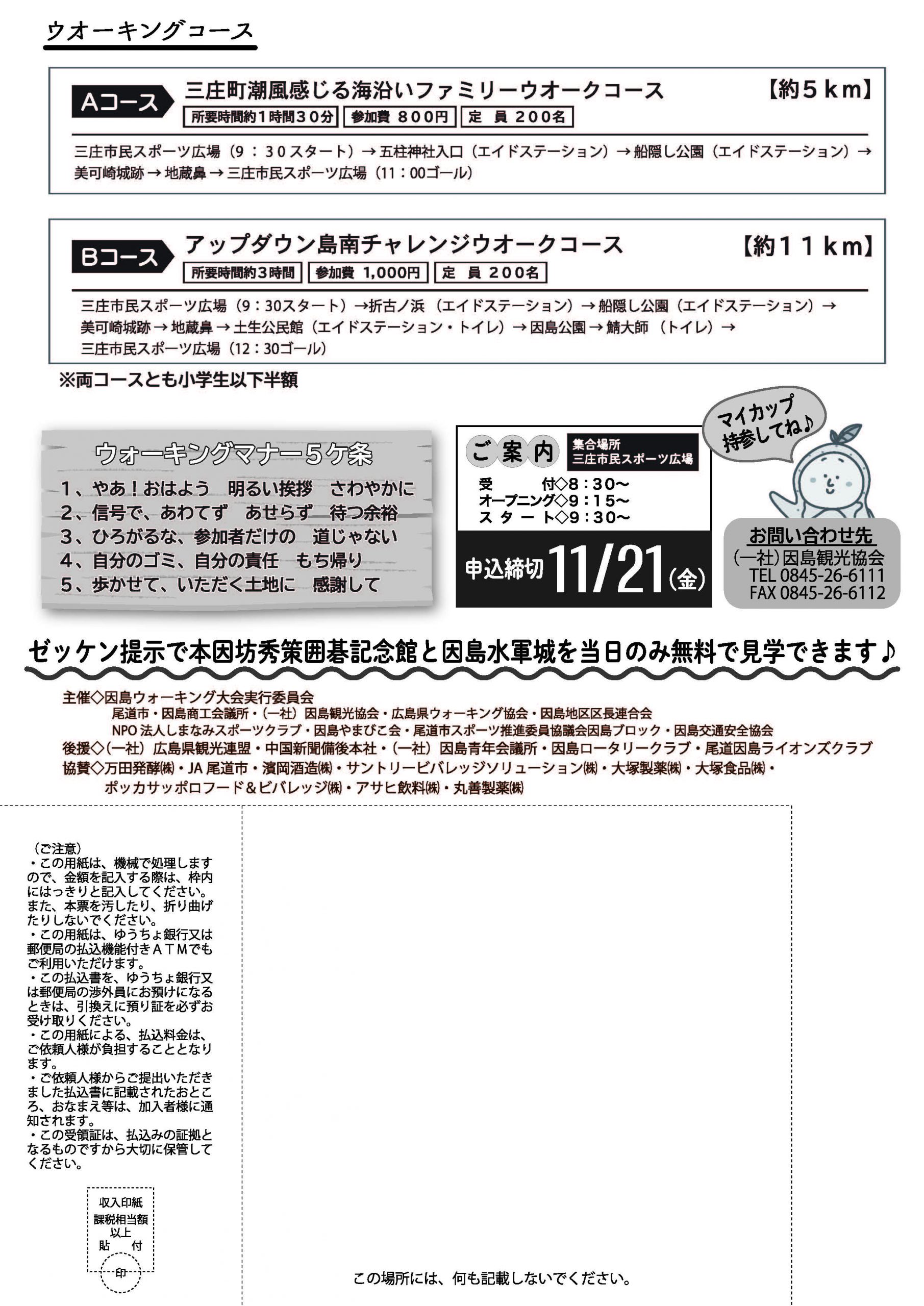 申込方法 | ★保険をかける上で年齢等必要となりますので記入欄に漏れのないようにご記入よろしくお願い致します! 【郵便振込】 チラシ付属の参加申込兼払込取扱票に必要事項をご記入のうえ郵便局より参加費をお振込みください。 4名様以上のお申込の場合は、因島観光協会までお問合せ頂くか下記(FAX申込用紙)からお申込下さい。 ※HPに掲載のチラシデータの払込取扱票は印刷しても使用出来ませんのでご注意下さい。 【直接】 チラシ付属の参加申込兼払込票に必要事項をご記入のうえ、因島観光協会まで参加費を添えてお持ち下さい。 受付時間 9:00~16:00(日祝休み) 詳しくはこちらをご覧ください→因島観光協会お休みのお知らせ 【FAX】 ★注意事項★ |