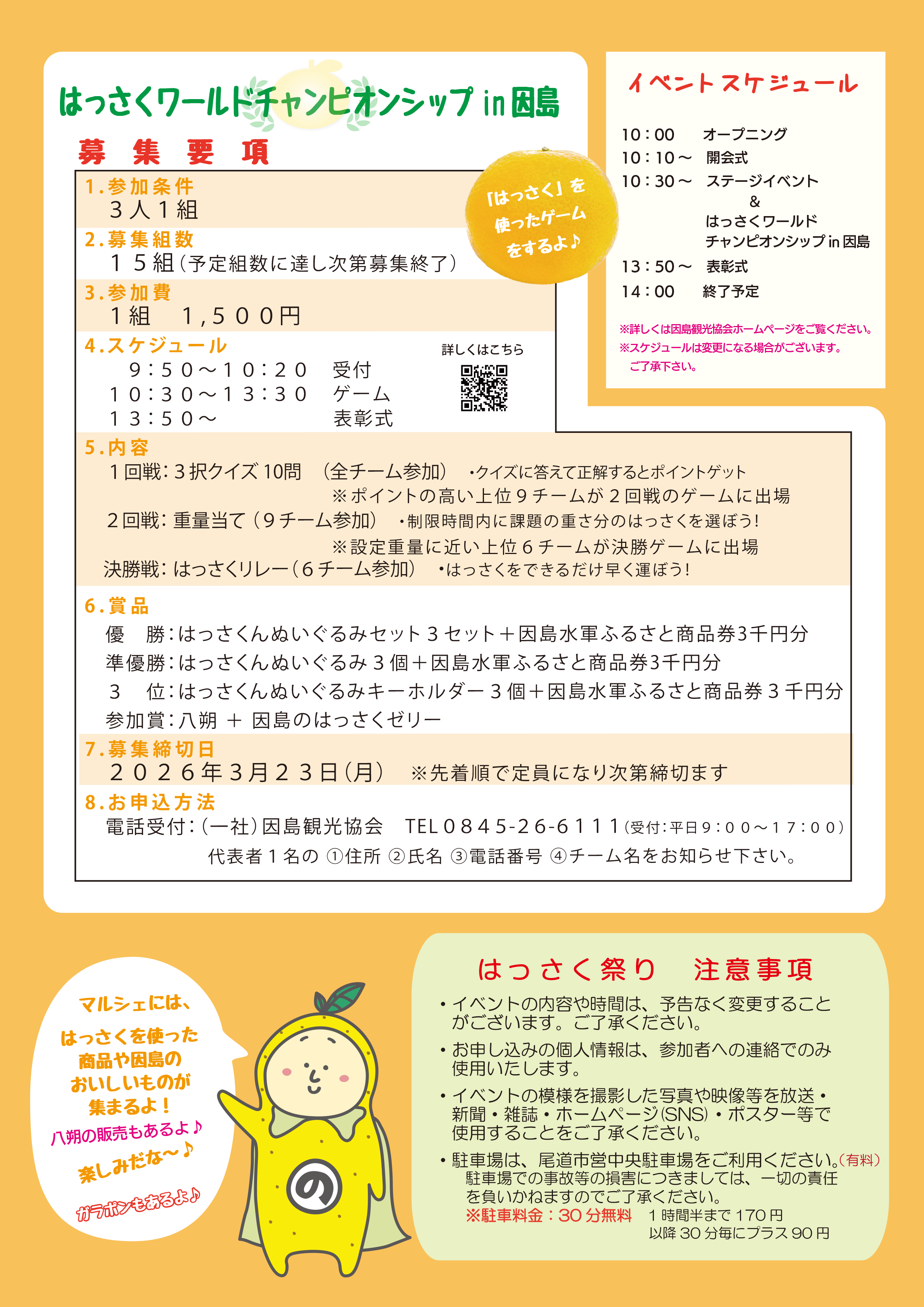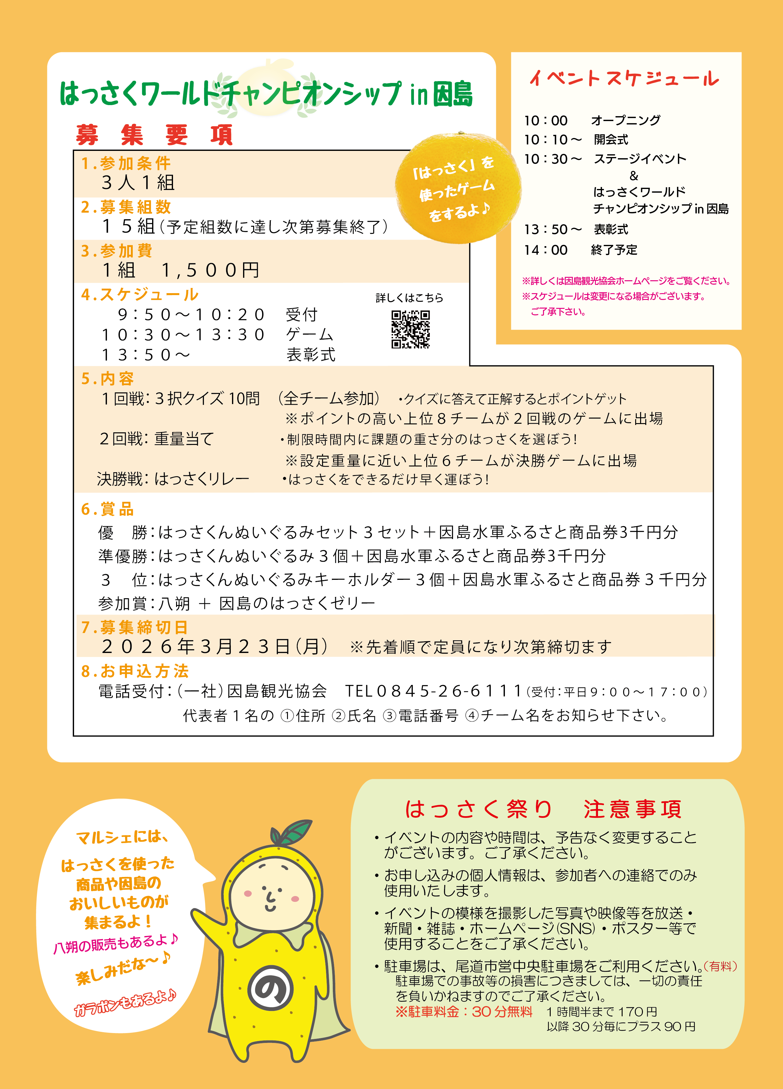 | 賞 品 | 優 勝:はっさくんぬいぐるみセット3セット+因島水軍ふるさと商品券3千円分 準優勝:はっさくんぬいぐるみ3個+因島水軍ふるさと商品券3千円分 3 位:はっさくんぬいぐるみキーホルダー3個+因島水軍ふるさと商品券3千円分 参加賞:八朔 + 因島のはっさくゼリー |